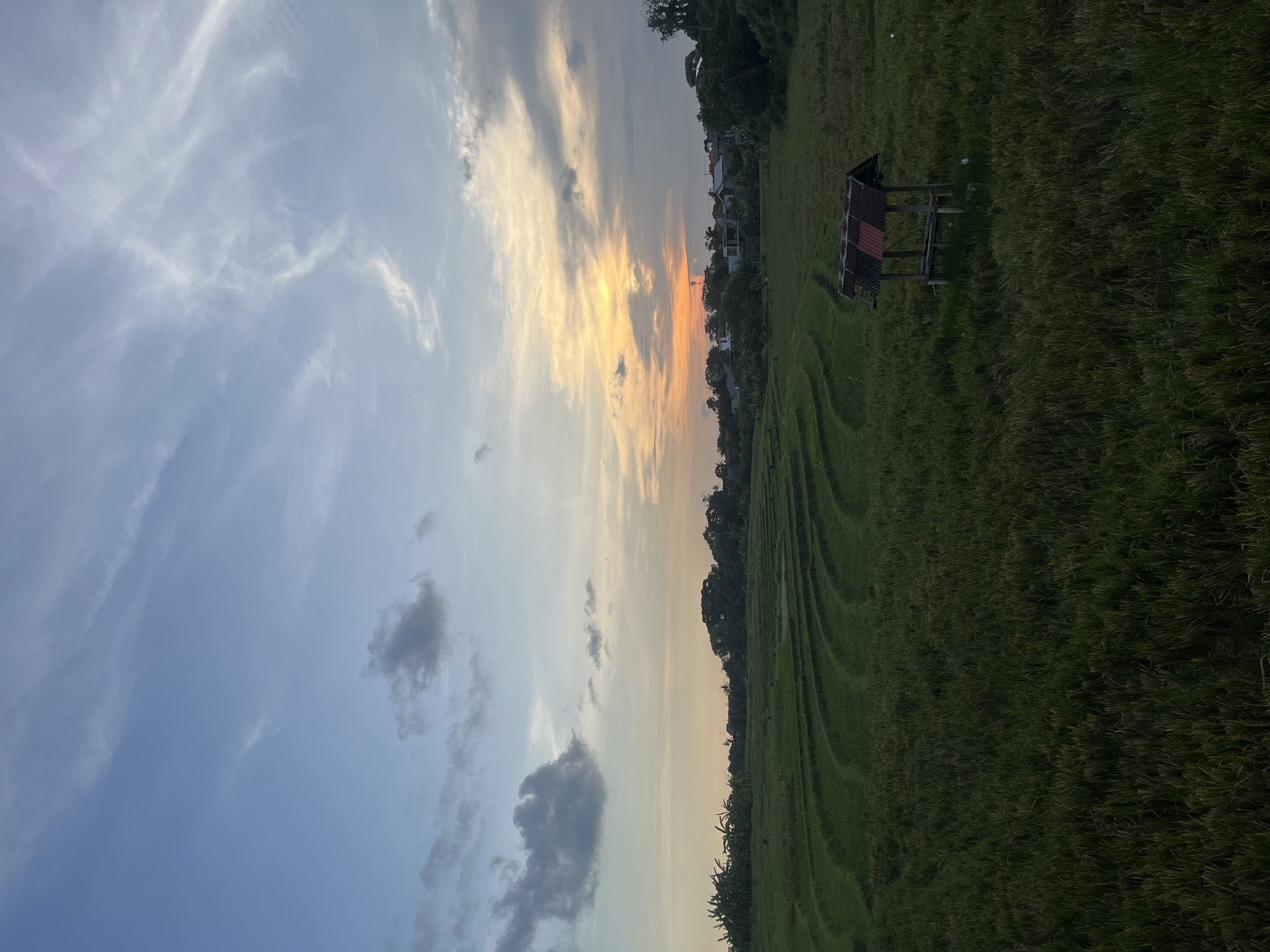 landscape in Canggu, Indonesia, during either sunset or sunrise. The left side of the image displays a sky with blue hues, fading into a golden-orange glow near the horizon. Wisps of clouds stretch across the sky. The right side of the image features a rice field, with clear terrace patterns. A small, dilapidated wooden structure with a partly damaged roof stands within the field. The field itself appears lush and green. In the background, there is a line of trees and a glimpse of some buildings. The picture is taken from a perspective that emphasizes the transition from the sky to the land. The time of day suggests that the light is soft, casting long shadows.
