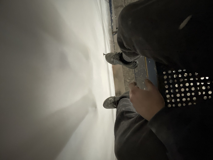 The scene, located in Gavril Genovo, Bulgaria, is depicted from an elevated, downward-angled perspective. The central subject is an individual, observed from the lower torso down, wearing dark trousers and dark, laced shoes. The trousers are stained with white specks, indicative of paint or dust. The individual's right hand is visible, positioned near a dark, rectangular object with a grid of circular perforations, resembling a rubber mat or industrial grating. Adjacent to the person's right leg and the perforated mat, a thin blue line or strip is discernible on the floor. The left side of the frame is largely occupied by a prominent, light grey to white vertical surface, possibly a wall or large panel, displaying minor textural variations and soft shadow transitions. The floor directly beneath and around the individual's feet is a darker, mottled surface, likely concrete, with scattered light-colored debris. No specific action beyond a static pose is evident.