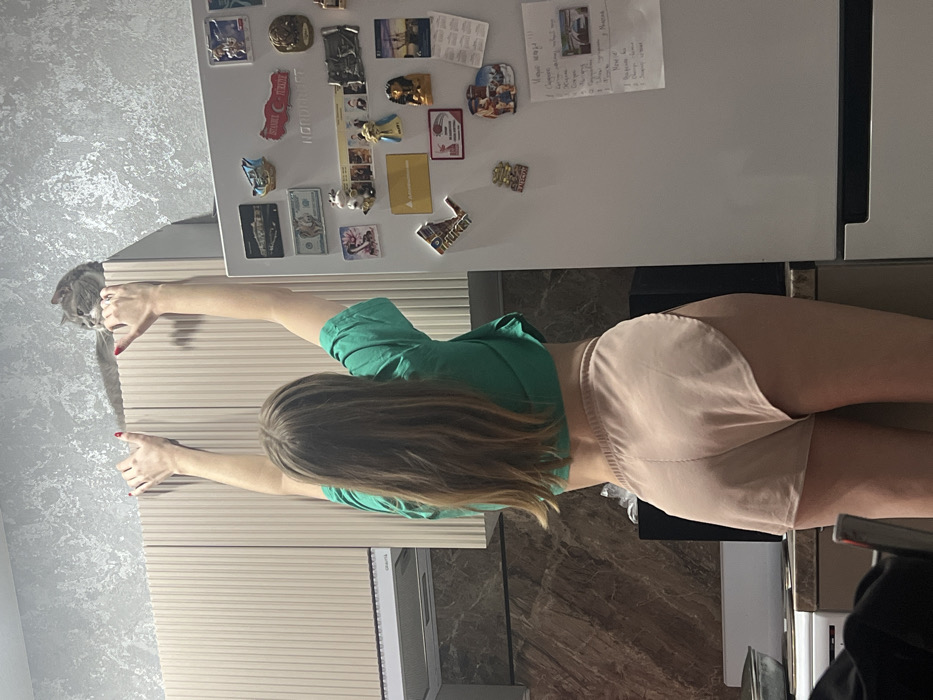 A woman faces away from the camera, wearing a green crop top and light pink shorts. Her arms are extended, seemingly reaching toward a gray cat positioned above a set of blinds. A refrigerator adorned with magnets and a note is visible in the background. The scene appears to be inside a home, with the kitchen countertop and wall coverings partially in view.