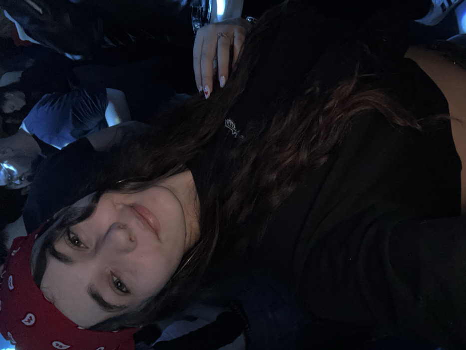 A young adult female is depicted in a selfie photograph, smiling directly at the camera. She wears a red bandana with a white paisley pattern, large gold-colored hoop earrings, and a black long-sleeved crop top featuring a small white winged logo on the left chest. Her long, dark, wavy hair cascades over her left shoulder and chest. Her right hand, visible in the lower right, shows manicured nails with a light base and a red heart design on the ring finger, which also bears a small ring. The scene is indoors, characterized by dim lighting with prominent blue illumination affecting the background elements. Several out-of-focus individuals are visible behind her, suggesting a social gathering. To the subject's upper right, a male figure with glasses and a beard, wearing a dark shirt, is partially illuminated by blue light. The setting is consistent with a nightclub or similar entertainment venue in Plovdiv, Bulgaria.