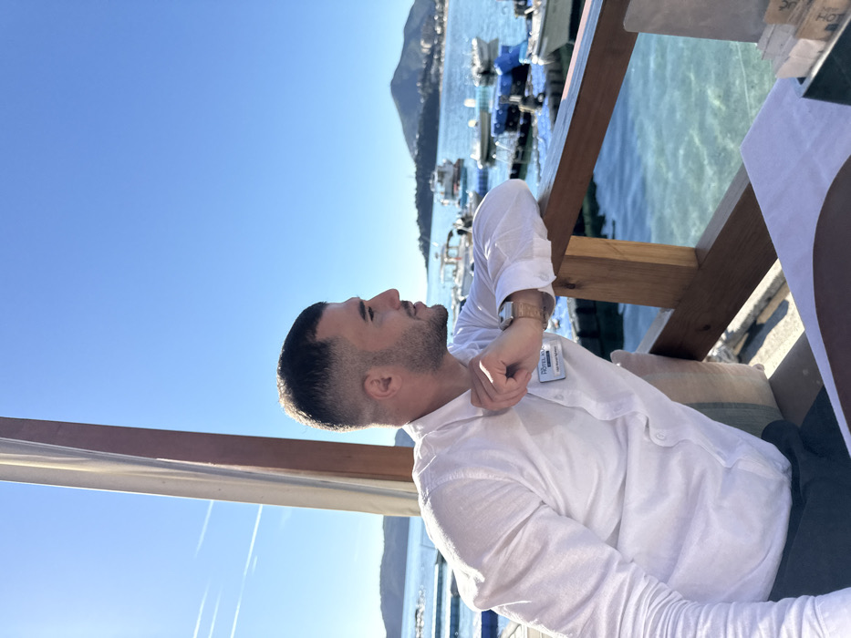 The image displays a male individual seated on an outdoor terrace overlooking a bay in Rafailovići, Montenegro