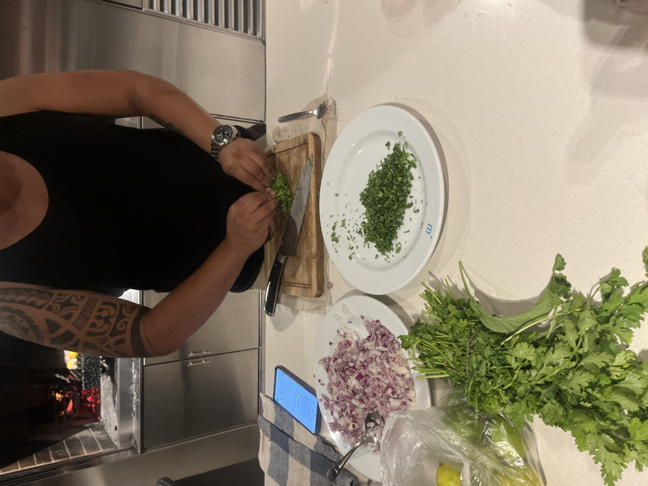 A person with arm tattoos wearing a watch chops herbs on a wooden cutting board. A stainless steel oven is in the background. The chopped herbs are then placed on a white plate. A second plate holds diced red onions, and a plastic bag contains more cilantro and a lime. A smartphone rests on a blue and white towel. A spoon is positioned near the onions.