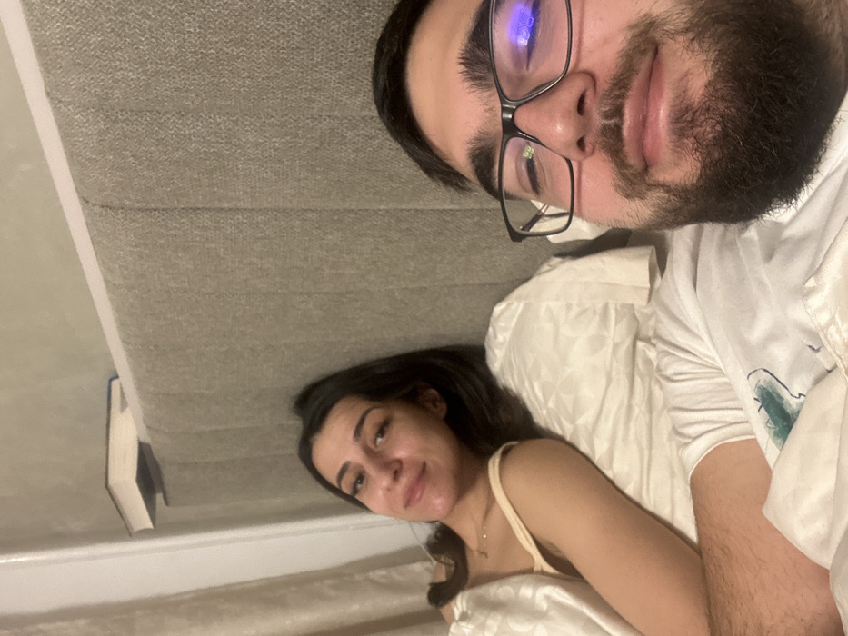 The image depicts an indoor scene within a bedroom. Two individuals, an adult female and an adult male, are in bed, appearing to pose for a selfie taken by the male. The exact location within the city of Ruse, Bulgaria, is not discernible from the visual information provided. The female is positioned on the left, partially visible from the chest up, lying on her side with her head resting on a white patterned pillow. She has dark hair, a light complexion, and is wearing a light-colored (possibly beige) camisole or tank top. A subtle gold-colored necklace is visible on her neck. She is covered by white, patterned bedding and is looking directly at the camera with a slight smile. A light-colored curtain is visible on the far left edge of the frame. The male is on the right, his face close to the camera, indicating he is holding the device. He has a beard, dark hair, and is wearing black-framed glasses which show reflections of ambient light. He is also looking at the camera with a slight smile. He is covered by white bedding, which shows a faint teal or greenish mark or design on its surface near his torso area. Behind both individuals is a padded, light grey fabric headboard. A single, light-colored book with a visible spine rests on top of the headboard. The overall lighting suggests an indoor, artificial light source.
