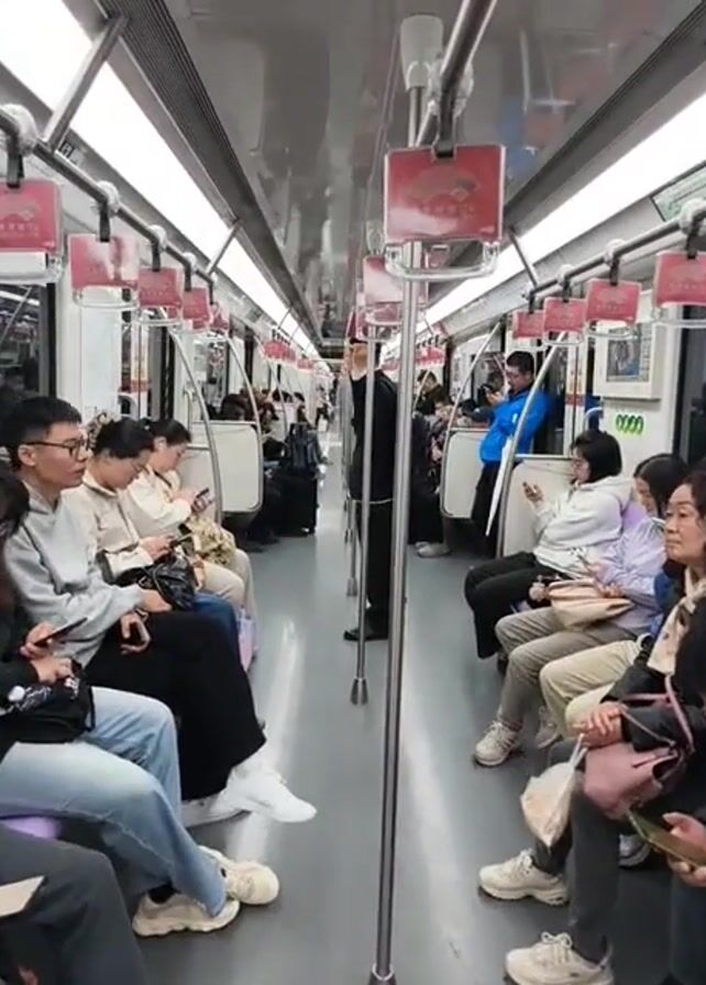 The interior of a subway car is depicted in this video. Passengers fill the train, most of them seated and looking at their mobile phones. Overhead lighting illuminates the scene, reflecting off the metal ceiling. A man in a dark suit stands in the center aisle holding onto one of the vertical support bars. The train interior is clean and modern. The train appears to be in motion.