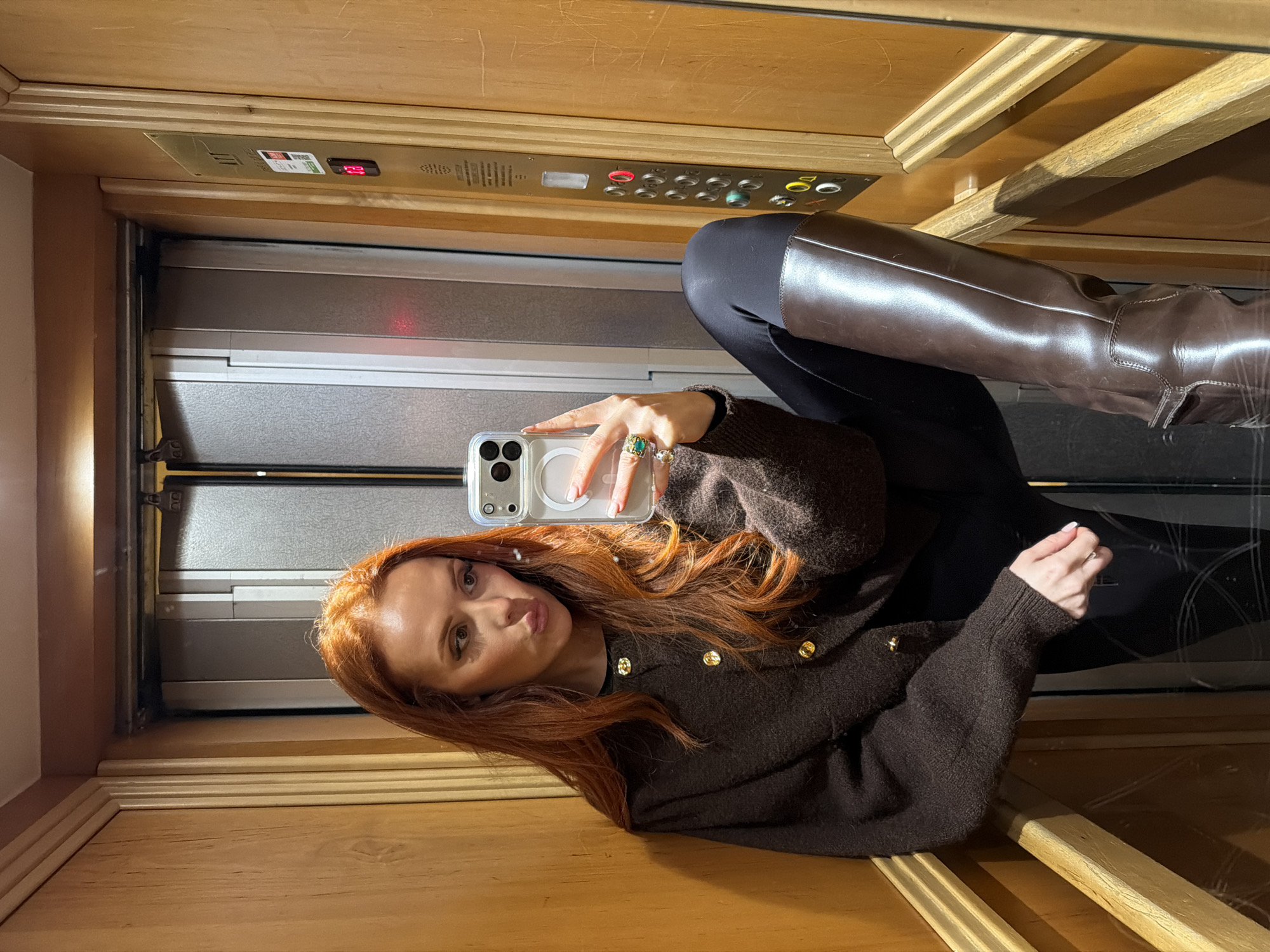 A woman is taking a selfie in an elevator. The elevator has wooden panels and a metallic door. The floor indicator shows the number "13" in red. The woman has long, red hair, wears a dark brown cardigan with golden buttons, black leggings, and brown leather boots. She is holding a smartphone with a clear case. She is wearing two rings on her right hand. The scene is likely indoors, possibly in a building in Paris, France, given the elevator's design and the woman's attire.
