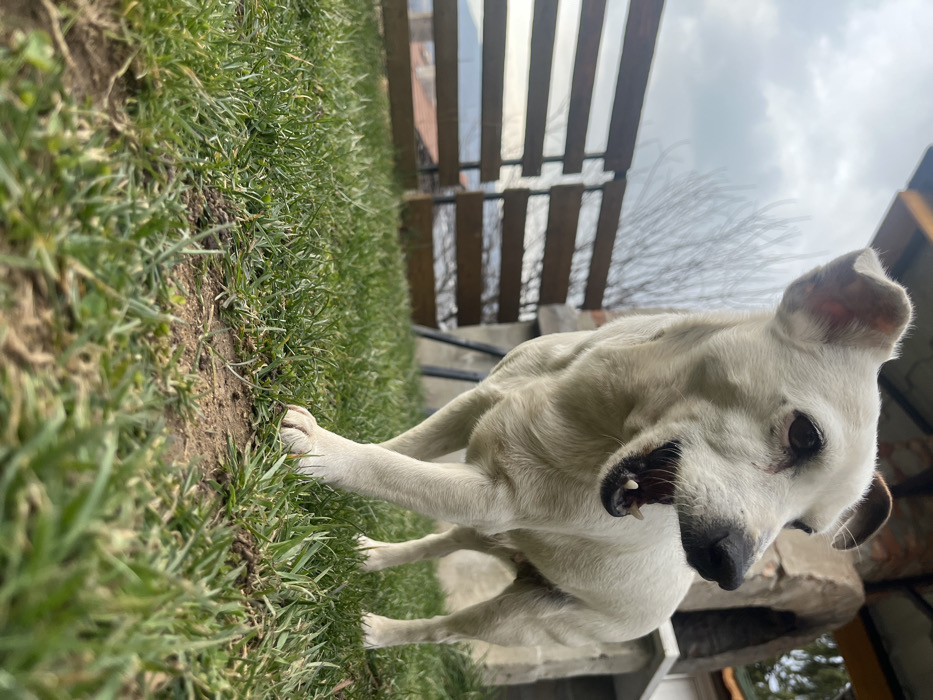 The scene depicts a short-haired white dog with light brown markings on its ears, positioned in the foreground, walking right to left across a patch of green grass. Its mouth is open, revealing teeth and gums, suggesting a bark or yawn. One front paw is lifted mid-stride. The perspective is low to the ground, emphasizing the dog and the grass. In the middle ground, a horizontal slatted wooden fence runs across the frame. Beyond the fence, bare tree branches are visible against an overcast sky. To the right, a brick structure, possibly an outdoor oven or part of a building, stands on a concrete base. Distant hills or mountains and what appear to be rooftops are discernible in the far background, indicating an outdoor, residential, or semi-rural setting within the city of Vladaya, Bulgaria. The lighting is diffused, consistent with a cloudy day.