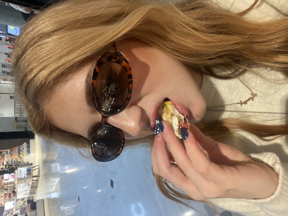 The image depicts a close-up of a female person in an indoor commercial setting within Tremblay-en-France, France. She has light brown hair, wears tortoise-shell oval sunglasses, and is dressed in a light-colored knitted sweater. A silver-colored necklace with a cursive name pendant is visible. Her left hand, adorned with dark blue nail polish featuring white polka dots on the ring finger, holds a round, split food item containing egg and meat to her open mouth as she consumes it. The environment, visible in the blurred background and as reflections in the sunglasses, is a modern retail area with display cases and a reflective light-colored floor, consistent with a shopping mall or airport terminal.