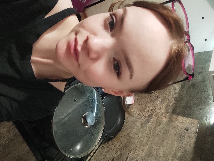 An individual, identified as a female, is depicted in a selfie-style photograph taken indoors, likely a kitchen, in the city of Марковский, Russia. The subject, with fair skin, light brown hair, and blue eyes, wears pink-framed eyeglasses resting on top of her head and a black top. A small, light-colored stud earring is visible in her right ear. She looks directly into the camera with a neutral expression. In the background, to the subject's right, a dark-colored stovetop is visible, featuring a dark frying pan and a dark pot covered by a clear glass lid with a silver knob. Condensation is present on the inside of the pot lid. Behind the cooking vessels, a mottled, light-colored granite or stone countertop/backsplash is visible, along with a partial view of a light-colored upper cabinet. The environment indicates a domestic setting.