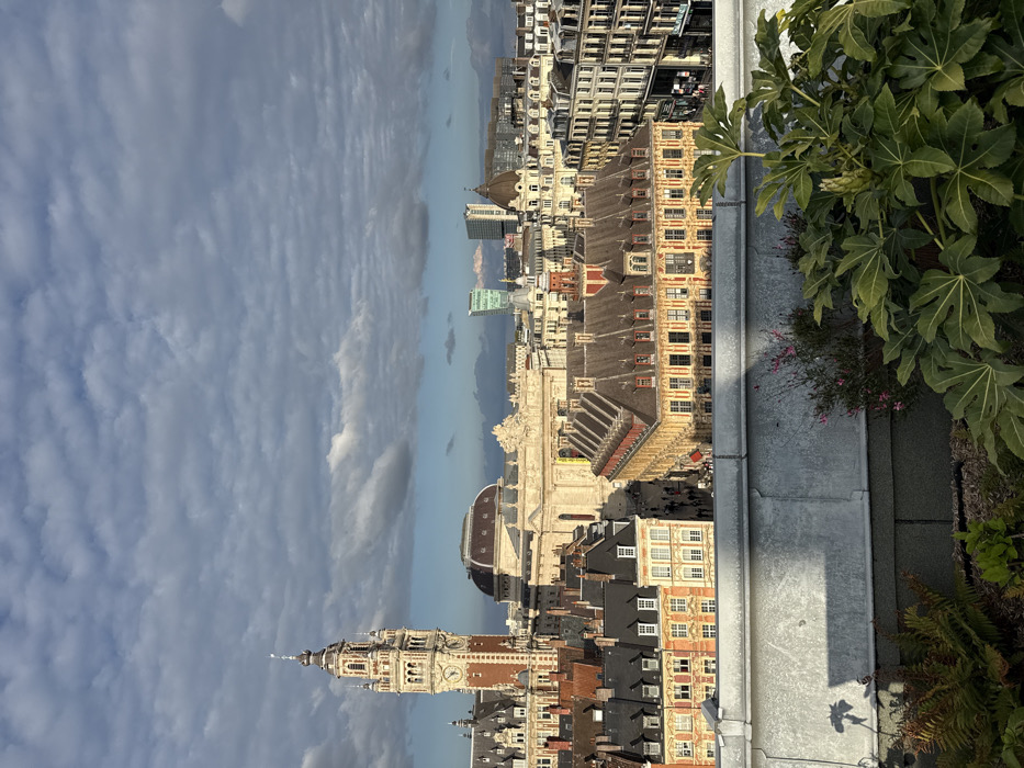This elevated, panoramic image depicts the city center of Lille, France, under partly cloudy skies with intermittent sunlight. The viewpoint is from a rooftop, evidenced by a flat, light gray metallic parapet or edge spanning the bottom third of the frame, below which various green plants, including large-leafed species and smaller ferns, are visible in containers or a garden bed. In the midground, the cityscape is dominated on the left by the Belfry of the Lille City Hall, a tall, ornate clock tower constructed of red brick and lighter stone, crowned with a spire. Adjacent to its right is the neoclassical Opéra de Lille, characterized by its prominent domed roof and elaborately decorated facade. To the right of the Opera, the distinctive Flemish Renaissance architecture of the Vieille Bourse is visible, featuring a rectangular structure with multiple dormer windows and detailed yellow-orange facades illuminated by direct sunlight. Between the Opera and the Vieille Bourse, a street or pedestrianized square, identified as the Grand Place, contains numerous small, indistinct human figures walking, indicating general pedestrian activity. Surrounding these landmarks is a dense array of multi-story urban buildings with varied architectural styles and rooflines. The background transitions into a mix of older and modern structures, including several high-rise buildings, notably a green-tinted glass tower on the far right. The sky occupies the upper half of the image, presenting a mix of altocumulus or stratocumulus clouds that cast shadows across parts of the city, interspersed with patches of clear blue sky, particularly towards the horizon. Sunlight primarily illuminates the Vieille Bourse and parts of the foreground, casting distinct shadows. No specific interactions between individuals are discernible due to the distance.