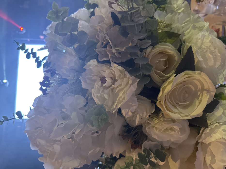 A cluster of white and cream-colored flowers, predominantly roses and hydrangeas, dominates the frame. Some greenery, including sprigs of eucalyptus, is interspersed throughout the arrangement. A bright, soft glow emanates from the left side of the image, with a red light faintly visible in the background, suggesting an indoor setting. The lighting gives the flowers a slightly ethereal quality.