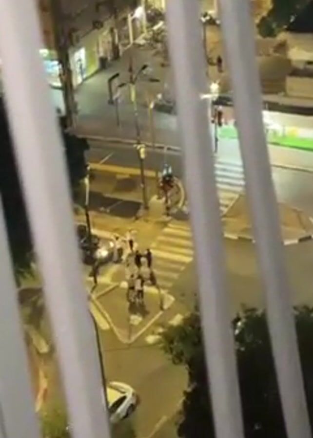 From a high vantage point through a railing, a nighttime street scene unfolds. Approximately ten individuals are visible at a crosswalk, most wearing light-colored clothing. One person in a dark jacket appears to shove another, causing them to fall to the ground. The others react with varying gestures, seemingly in response to this action. A white car approaches the intersection slowly. Streetlights illuminate the area, and buildings line the streets. Traffic signals are visible, with one showing a red light. The setting appears to be an urban environment.