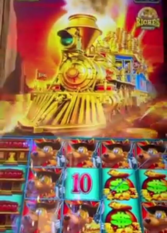 slot machine, possibly in a casino. The game appears to be Western-themed, with images of a golden train, cartoon dogs dressed as cowboys, money bags, and buildings. The slot machine is actively playing, with numbers rapidly changing on the display. The numbers indicate both the balance available for betting and the current amount being won. On the top portion of the machine are displays showing large amounts of money, possibly indicating the jackpot amounts. The machine also has smaller screens that show cartoon images.