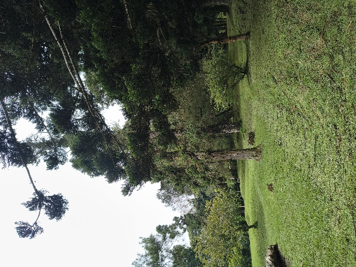 A verdant park scene with towering trees lining a grassy expanse. The ground is carpeted with bright green grass, unevenly lit. Tree trunks stand prominently, their textured bark visible. Lush foliage fills the upper portion of the frame, obscuring the sky in places, creating an enclosed, natural space. The perspective is from below, gazing upward towards the canopy.