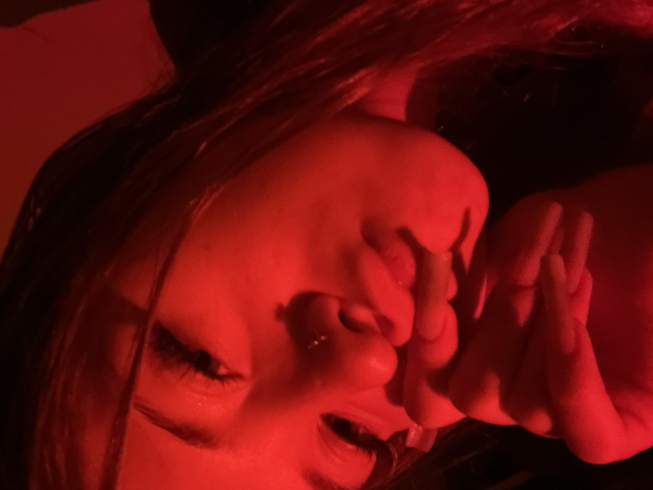 A close-up, angled photograph depicts a female individual's face and upper torso, illuminated primarily by an intense red light source
