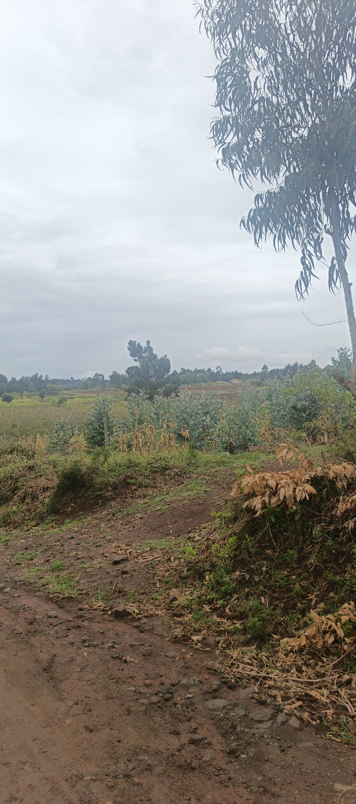 A rural landscape under an overcast sky. In the foreground, a rough, red-brown dirt road leads the eye towards a field of mixed vegetation. Crops, possibly corn, stand amongst leafy green plants. A tall, wispy tree with drooping leaves dominates the right side of the frame. Faint trees line the distant horizon.
