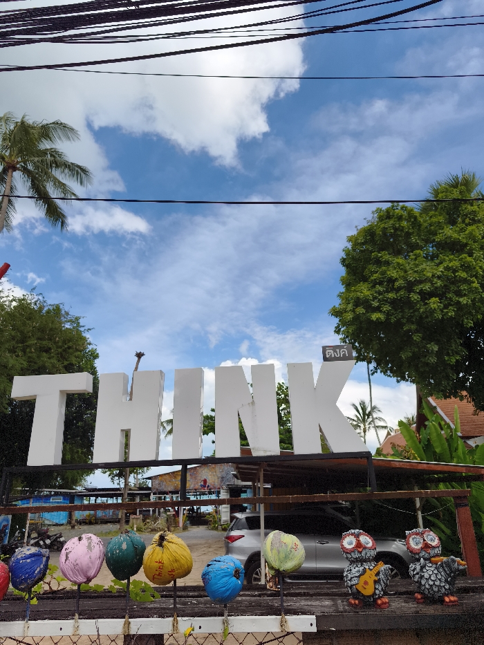 Beneath a partly cloudy sky and a tangle of overhead wires sits a large, white "THINK" sign. The sign is supported by a metal structure and is surrounded by lush green trees, including a palm tree. In front of the sign is a row of colorful, painted coconuts on sticks and two owl statues. A car is parked in the background, and glimpses of a beachfront area are visible beyond.