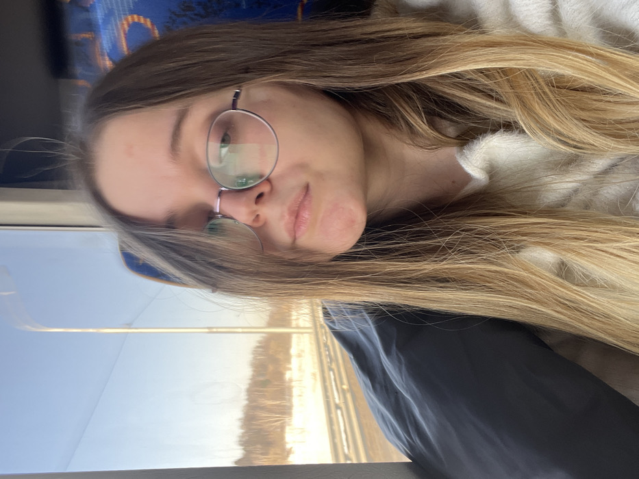 The image captures a young female within a vehicle interior, with the scene identified as Ostrovtsy, Russia. The subject is positioned facing forward, slightly turned to the left within the frame, with her head and upper torso visible. She has long, straight hair, which is blonde with darker roots, falling over her shoulders and chest. She wears round, thin-framed glasses with a light-colored, possibly purple or rose gold, frame. Her eyes are partially obscured by the glasses and hair, appearing to look forward, and her lips are closed in a subtle pout. A minor reddish mark is visible on her chin below the lower lip. She is dressed in a light-colored, likely cream or white, fuzzy sweater or top, and a dark blue or black garment covers her left arm and shoulder. To her right, a blue patterned seatback, featuring abstract lighter blue designs, is visible. Through the large window on her left, an exterior winter landscape is observed. This landscape includes a snow-covered roadside, a parallel road or track, and a distant line of bare deciduous trees set against snow-covered ground. The sky is clear blue near the horizon, illuminated by a bright, low sun, suggesting either morning or late afternoon conditions. A tall, slender pole stands vertically in the middle ground outside the vehicle.