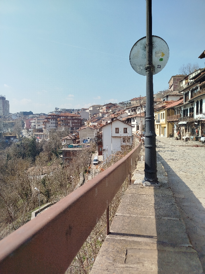 The image depicts an elevated outdoor scene in Veliko Tarnovo, Bulgaria, under a clear, light blue sky during daytime. In the immediate foreground, a weathered, dark-colored ornate streetlamp post stands on the right, casting a distinct shadow to its left on the cobblestone and concrete path. The reverse of a circular road sign, faded and marked with several small stickers, is affixed to the streetlamp post. A rusty brown metal barrier extends diagonally from the lower left, running along a concrete ledge that overlooks a descending valley. The midground reveals a steep hillside covered with numerous bare deciduous trees, indicating a dormant season. Clustered along the valley slopes and further up the opposing hill are various buildings. These include traditional houses with white, yellow, and beige facades, often featuring wooden balconies and distinctive red-tiled roofs, interspersed with some multi-story, more modern structures. A white utility van is parked on a lower road within the valley, and a streetlamp is visible among the trees. The background shows further urban development with additional residential and multi-story apartment buildings. No individuals or specific interactions are visible within the frame. The overall environment suggests a well-established urban landscape characterized by hilly terrain and traditional Bulgarian architecture.