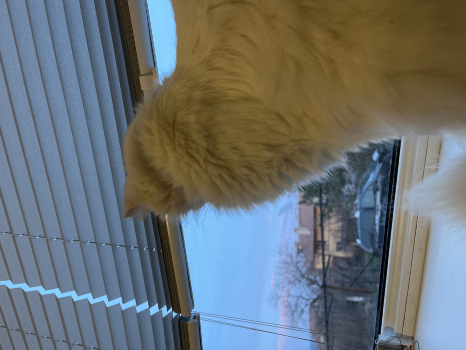 - "A white, long-haired cat, viewed from its rear right, is positioned on a white windowsill looking out through a window in Opitsvet, Bulgaria" by FM-Yvg1s2, licensed under CC BY 4.0
