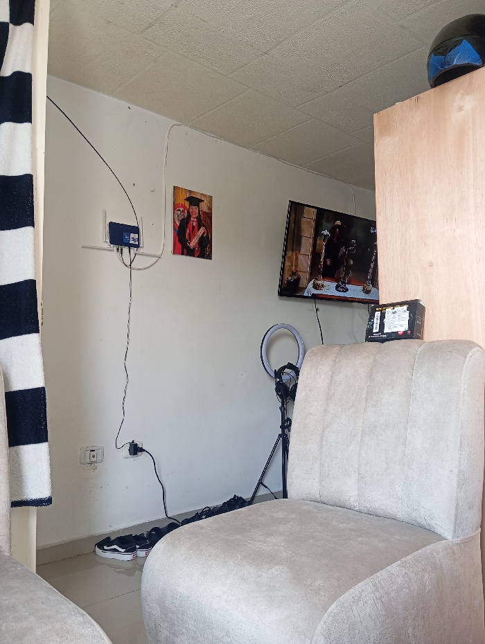 A furnished room includes a beige upholstered armchair, a flat-screen TV, a ring light on a tripod, and a router mounted on the wall. Underneath the router, a pair of black and white sneakers are placed on the floor. A framed picture of a person in a graduation gown is hung on the wall. A black motorcycle helmet rests atop a wooden cabinet. A black and white striped curtain is visible on the left side of the room.