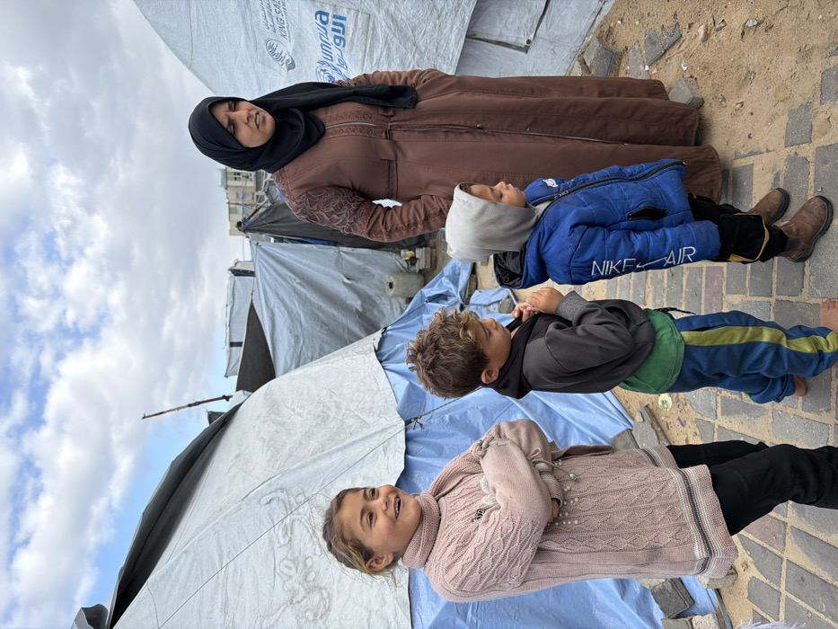 In the city of Gaza, Palestinian Territory, an outdoor scene depicts an adult woman and three children standing amidst an encampment of makeshift tents under an overcast sky