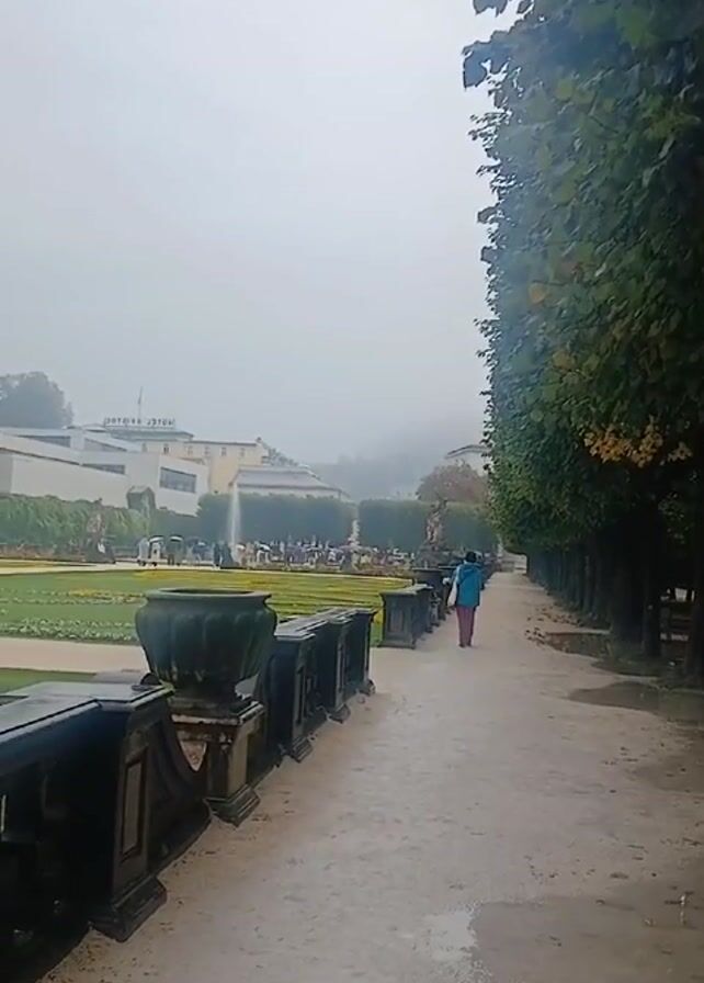 fog-laden park with people walking in the distance. A stone path runs along the right side of the frame, lined with trees. To the left of the path is a row of dark, ornate stone planters. Across from the planters is a lawn with intricate flower beds and a large fountain. In the background, a large building is visible with the words "Hotel Bristol" displayed on its roof. The overall scene is misty and overcast.