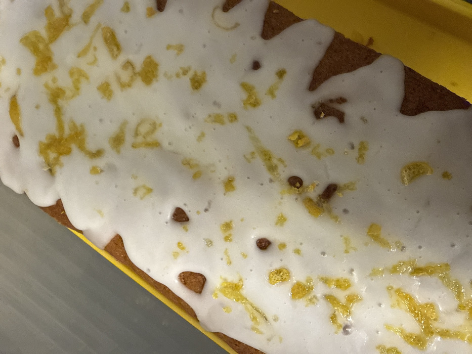 A close-up shot showcases a glazed loaf, generously topped with a thick layer of white icing. Scattered across the icing are yellow specks, possibly lemon zest. Small brown flecks are also visible. The loaf appears to be baked to a golden brown, peeking through the icing. The entire dessert sits on a yellow and gray surface.
