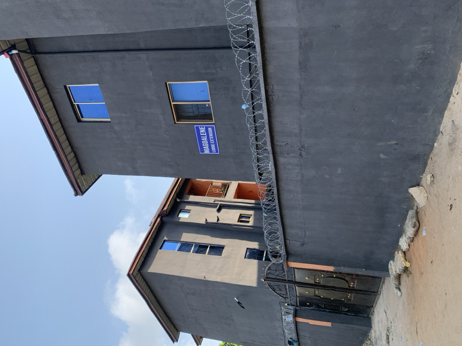 The scene, located in Eziobodo, Nigeria, depicts two multi-story buildings with dark charcoal gray exteriors and brown-trimmed roofs. The structure on the right features a blue rectangular sign stating "MAGDALENE LODGE EXTENSION." Both buildings present multiple windows with reflective blue glass. A dark gray concrete wall, topped with coiled concertina wire, runs across the mid-ground. An ornate black metal double gate with orange accents is integrated into the wall on the left side of the frame. The immediate foreground shows an unpaved light brown ground surface with scattered stones and minor debris. The sky above is clear blue with sparse white clouds. No individuals are visible.