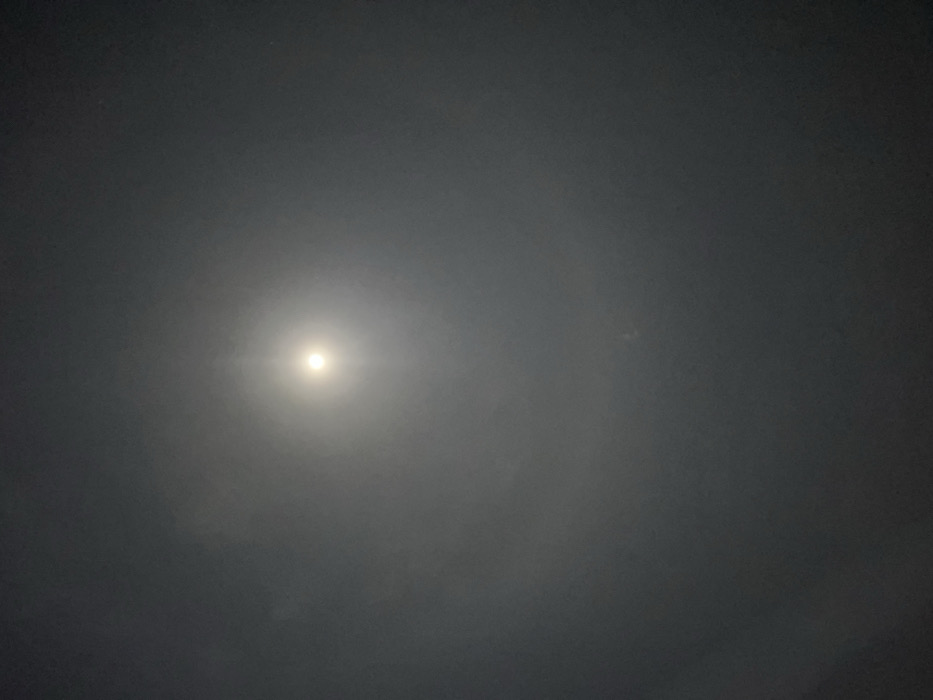A luminous, singular light source dominates a hazy, grayscale sky. The light's intensity diffuses outwards, creating a soft, glowing halo. The surrounding sky appears uniformly gray, possibly due to fog or cloud cover, with subtle variations in tone. A minor smudge is visible in the upper right, adding to the atmospheric feel.