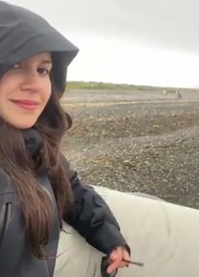 A woman wearing a black hooded jacket and green pants sits inside a white inflatable boat, holding a pair of sunglasses. She smiles towards the camera while the camera pans down and reveals two penguins standing near the edge of the boat on a pebble beach. The sky is overcast and the beach extends into the distance.