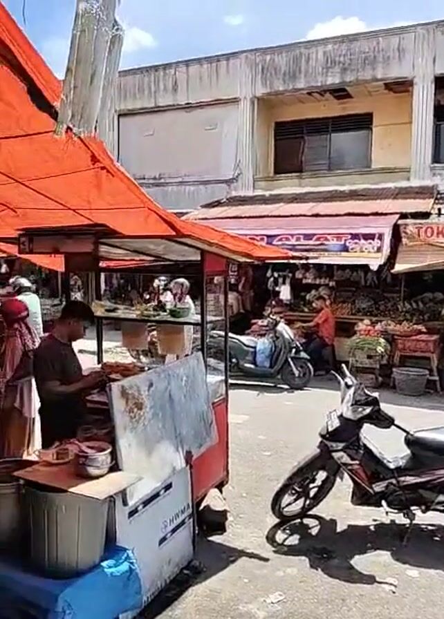 market street in daytime. Various vendors occupy stalls under orange awnings. The stalls have food items, bananas, and other merchandise. People are present at the stalls. Several motorbikes are parked on the road. One vendor is preparing food behind a counter. The architecture surrounding the market is a two-story building with windows. The overall environment is a bustling outdoor marketplace.