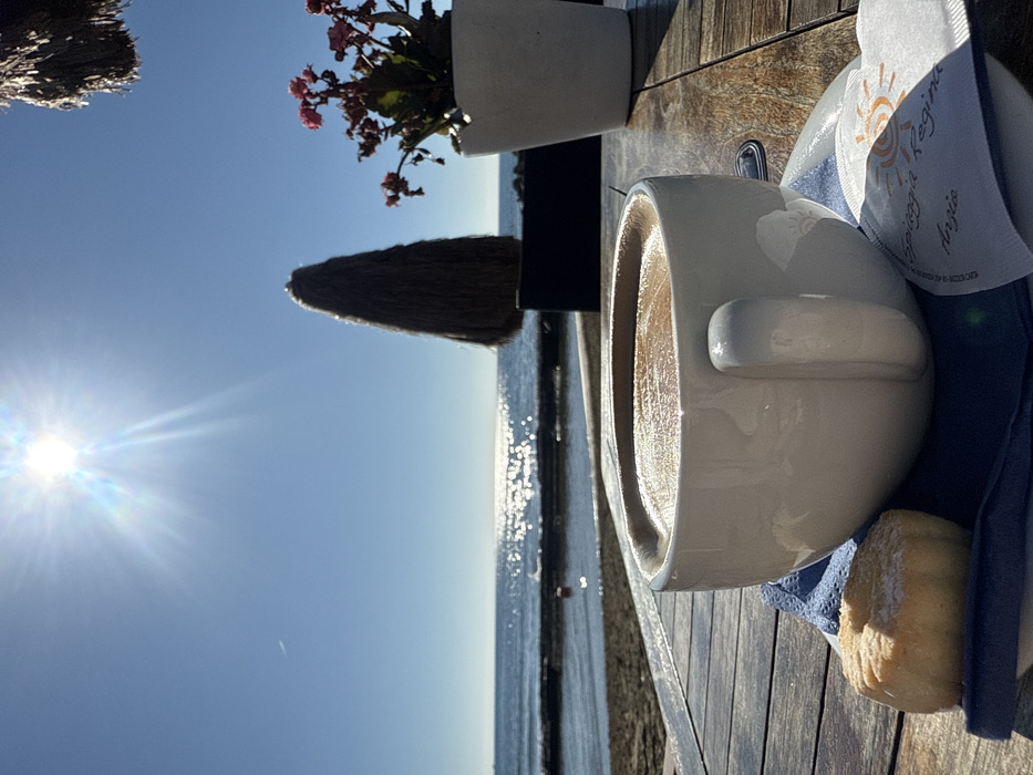 The scene depicts a beachfront table setting at Spiaggia Regina in Anzio, Italy, under direct sunlight. In the foreground, a white ceramic mug, containing a frothy, light-brown beverage, rests on a dark blue fabric napkin. To the left of the mug, a single, light-brown, round pastry or cookie is also on the napkin. To the right of the mug, a white sugar packet with a sun logo and the text "Spiaggia Regina Anzio" is present. These items are situated on a wooden slatted table, casting sharp shadows towards the viewer's right, indicating the sun's position. Beyond the table, a sandy beach leads to the Mediterranean Sea, characterized by calm, blue water reflecting bright sunlight across its surface. A small, red spherical buoy is visible floating in the water near the shoreline. In the midground, a dark, conical object, consistent with a closed beach umbrella, stands upright. To its right, a white potted plant with small pink flowers is positioned on the table. The background features a clear, bright blue sky with the sun prominently displayed in the upper left quadrant, emitting a strong lens flare. A faint contrail is visible in the sky to the far left. No individuals are visible within the frame.
