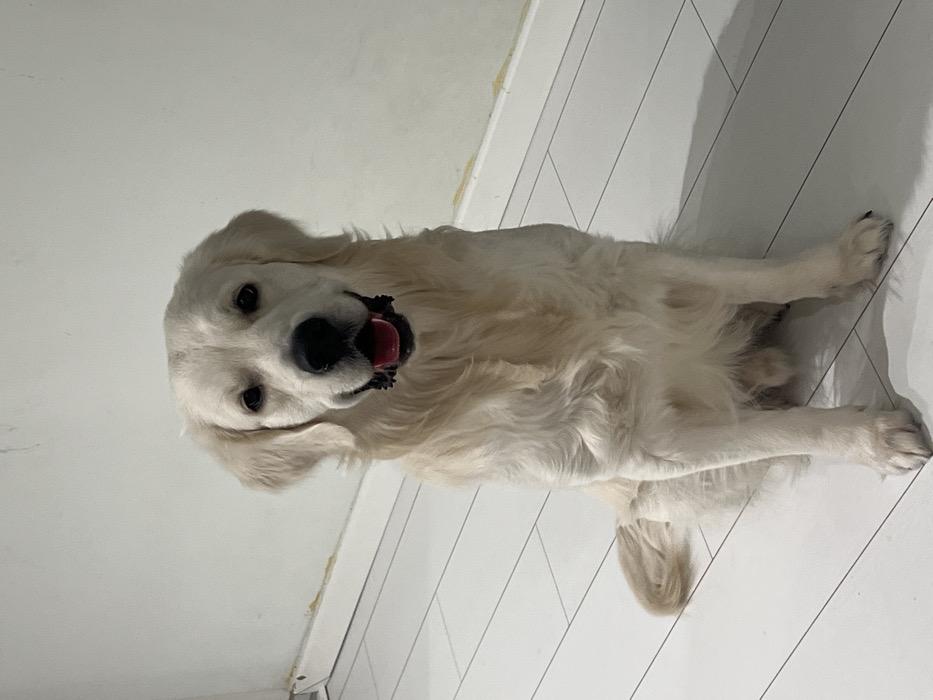 - "A golden retriever is laying on a white, planked floor, with its head towards the upper left and its body extending diagonally to the lower right" by FM-mWrWX2, licensed under CC BY 4.0