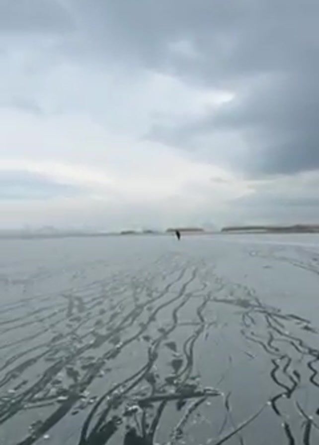 A wide shot shows a person walking on a large icy field. The ice is cracked with many visible trails. In the distance is land with mountains behind it, under a cloudy sky.
