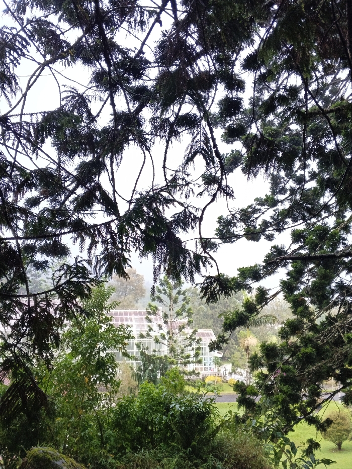 A view through dense foliage frames a building with a multi-faceted glass roof. The foreground is filled with various green shrubs and trees, their branches partially obscuring the structure. Behind them, more trees fade into the mist. The sky is overcast. The building appears to be situated on well-maintained grounds with visible pathways.