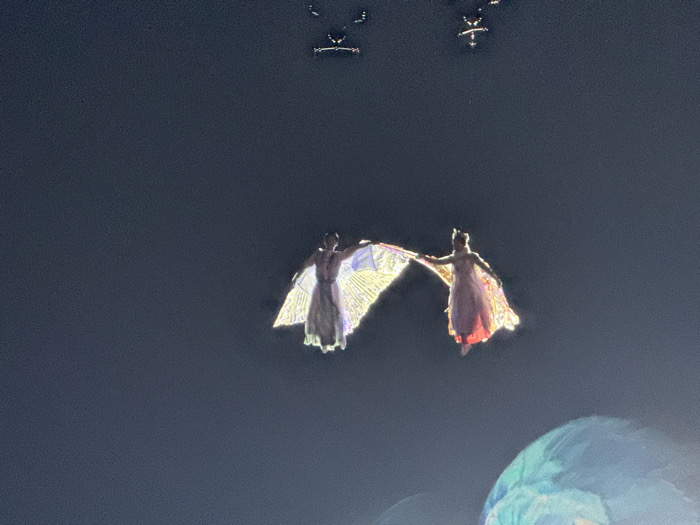 The image displays a nighttime or indoor performance scene, likely within Chaoyang District, China. Two individuals are suspended in mid-air against a dark, uniform background. The individual on the left wears a light-colored, flowing gown with an exposed back, holding a segment of a large, brightly illuminated, translucent fabric structure. The individual on the right wears a darker, pink-red flowing gown and holds another segment of the same structure. This multi-segmented structure, resembling wings or a fan, is illuminated from behind, exhibiting blue, yellow, and red tones, and glows intensely. Above the performers, several small, distinct points of light are discernible, arranged in an irregular pattern. A blurry, multi-colored object, primarily blue and green, occupies the lower right foreground.