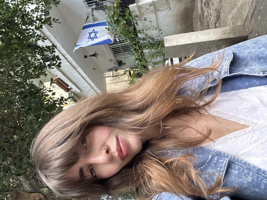 A female subject, appearing to be in her 20s or 30s, is captured in a close-up, likely a selfie, in an outdoor setting. She has light brown, wavy hair with bangs, light-colored eyes, and a silver hoop nose ring in her left nostril. She is wearing a light blue, acid-wash denim jacket over a white V-neck top with a textured trim. A beaded silver-colored choker with a small, pointed pendant adorns her neck. Her expression is a slight smile. The background identifies the location as Tel-Aviv, Israel. A white, multi-story building facade is visible, from which an Israeli flag (blue Star of David and stripes on white) is mounted horizontally. Below the flag, green foliage from potted plants and climbing vines covers parts of the wall. An outdoor light fixture is also present on the building. To the upper left, dense green tree foliage is observed. The ground surface is light-colored pavement.