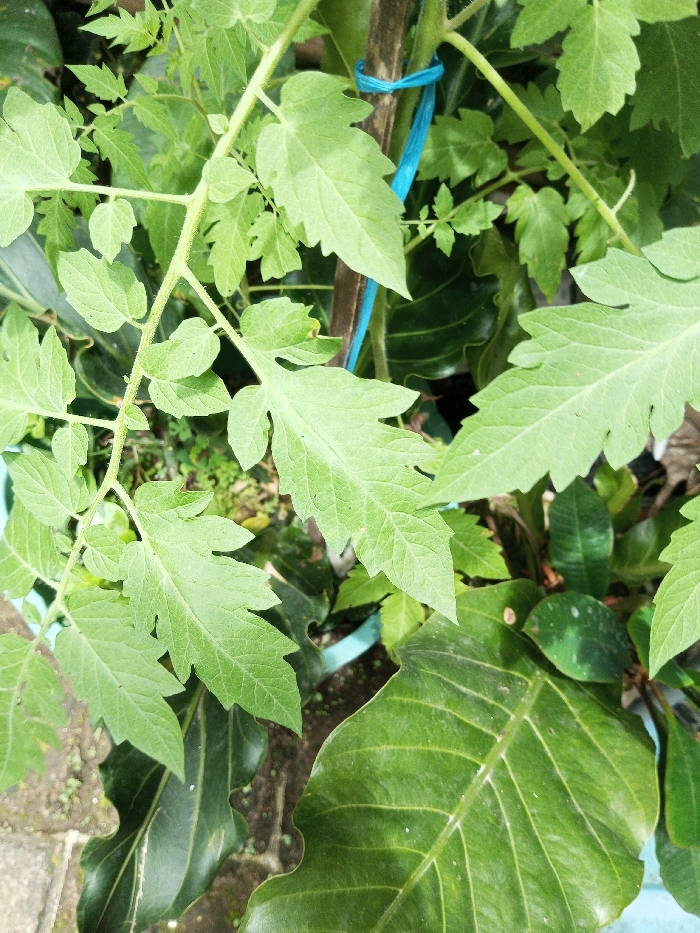 A vibrant garden scene unfolds, dominated by lush green foliage. Tomato plant leaves with serrated edges take center stage, supported by a stake secured with blue ties. Below, broad, textured leaves from other plants create a diverse ground cover. Hints of a pot and ground textures are visible, suggesting a container garden setting. The composition captures the abundance and variety of a thriving green space.