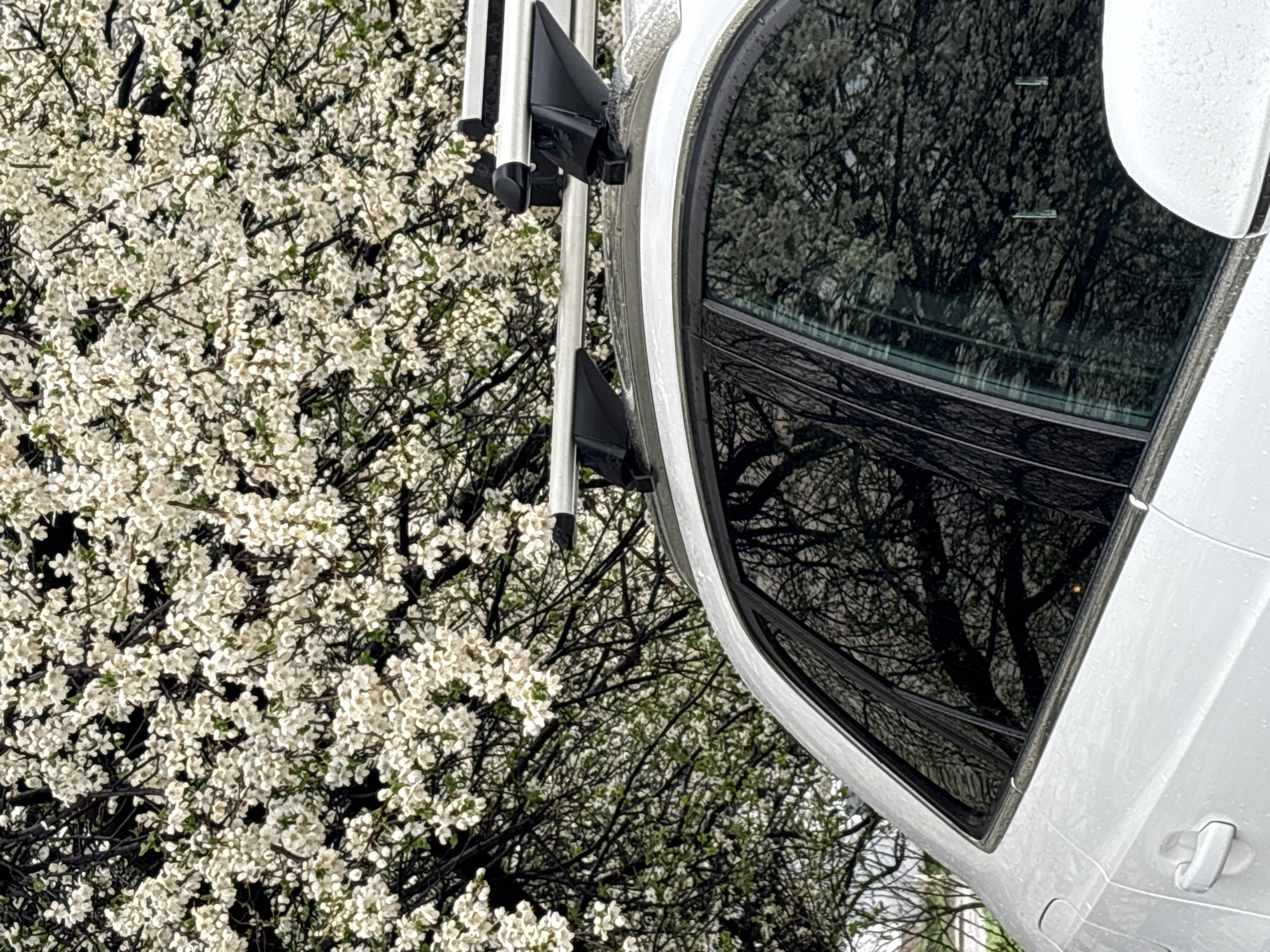 The image displays the right rear quarter of a white passenger vehicle, likely an SUV or crossover, parked outdoors in Sofia, Bulgaria. The vehicle's exterior surfaces, including the roof, body panels, and side mirror, are visibly wet with water droplets. Silver-colored roof racks are installed on the vehicle's roof, featuring black mounting points. The car's windows are tinted, reflecting a distorted image of tree branches and blossoms. In the background, a deciduous tree heavily laden with small, dense white blossoms dominates the upper and central portions of the frame. Dark, bare branches are interspersed among the flowers, with hints of green foliage. No individuals are present, and no actions or interactions are depicted. The scene occurs during daytime under diffused, overcast lighting, consistent with a spring environment.