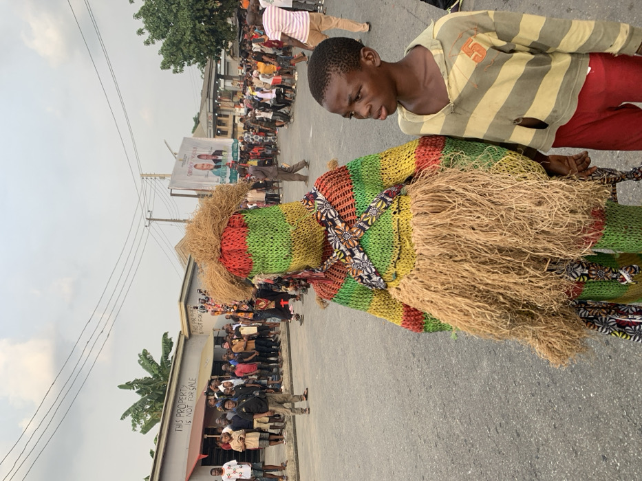 A boy in a tattered striped shirt and red pants stands next to a costumed figure in red, yellow, and green with raffia-like hair and beard. The figure's costume has fabric straps in an 'X' across the chest. A crowd of people lines both sides of the street behind them. A building with a sign that reads "THIS PROPERTY IS NOT FOR SALE" is on the left. A banner depicting two people hangs above the crowd.