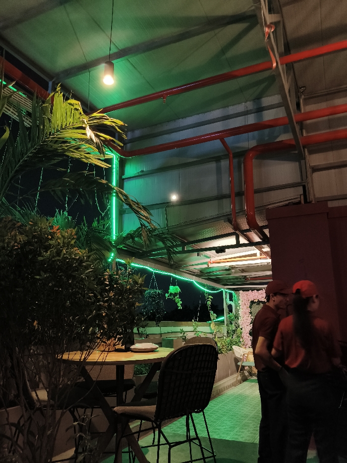 The image depicts an illuminated outdoor or semi-outdoor dining and lounge area within an establishment located in Bengaluru, India, observed at night. Overhead, a metallic roof structure is visible, supported by metal beams. Red utility pipes are routed along the ceiling and walls. Green LED strip lighting runs along the perimeter of the space, casting a predominant green hue across the environment, including the tiled floor. A single warm-white pendant light fixture hangs from the roof structure on the left. Lush green foliage, including large palm-like fronds and various bushes, is arranged throughout the area, with some smaller plants hanging from the ceiling structure. In the foreground on the left, a round wooden table is set with a white plate and a dark beverage glass, accompanied by two dark woven chairs with padded seats. On the right side of the frame, three individuals are visible, presumably staff members, wearing dark red uniform shirts and dark trousers. Two of them wear matching red baseball caps. They are standing, partially obscured, and mostly facing away from the camera. Behind them, a white floral decorative wall panel is partially visible. The background reveals a dark night sky and portions of an adjacent dark building structure.