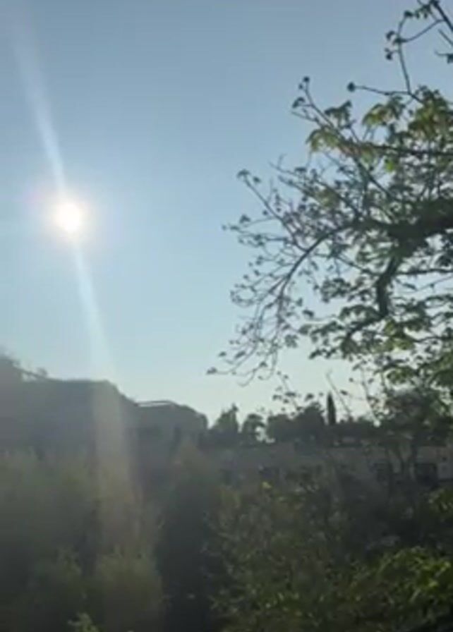 sunny outdoor scene. The sun is visible in the sky, with its light casting a glare. To the right, there is a tree with green leaves. In the background, there are buildings on a hillside, surrounded by trees and greenery. A white railing is visible in the foreground, suggesting the scene is being viewed from a balcony or elevated position.