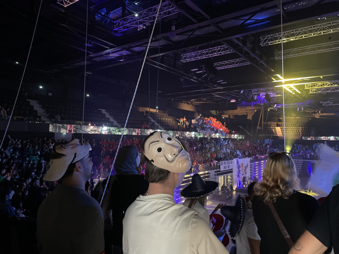 An indoor event is captured from within a large arena in Aix-en-Provence, France. The scene is dimly lit, dominated by the dark interior of the venue, with stage lighting providing purple, yellow, and blue illumination. In the immediate foreground, multiple individuals are observed from behind, facing a central stage or performance area. One prominent figure wears a beige Salvador Dalí mask over a light-colored shirt. To their left, another individual wears a brown, stylized animal-like mask. Between these two, a person with a dark head covering is visible. To the right of the Dalí mask wearer, a blonde individual in a black shirt with a visible shoulder strap stands. Further right, a partial view of another person in a black shirt is seen. Two small black sombreros are also noticeable among the foreground figures. Thin white cables or ropes descend vertically from the dark ceiling structure, which features exposed metal trusses. In the midground, a substantial crowd occupies tiered seating sections, with noticeable concentrations of red-clad attendees on the right and green-clad attendees on the left. A stage or platform area is visible with banners, one displaying a stylized cactus and text.