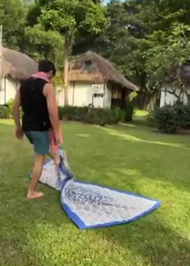 The scene is a grassy lawn in a tropical or subtropical location, with a fair-skinned man, wearing a black sleeveless shirt and turquoise shorts, attempting to position a patterned blue and white beach towel on the grass