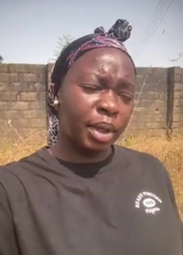 A woman stands in front of a brick wall and dry grass, recording a selfie video. She wears a black t-shirt with a circular logo reading “READY POSITION 1975 Players” and a printed headscarf. Behind her, a partially obscured figure can be seen. The sky is visible above the wall and a few utility poles and wires run across the scene. The woman speaks directly into the camera.