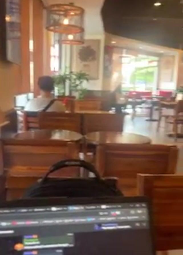 interior of a coffee shop. The shop is populated with patrons seated at tables and chairs, many of which are made of dark wood. Several people are visible; some are sitting alone, and others are in groups. The shop is well-lit, with natural light streaming in through large windows. Above the tables, there are modern light fixtures. The camera is positioned near a laptop, which is showing a screen full of code or chat logs, suggesting the person is working or chatting online. The foreground also includes a portion of a black backpack. The overall environment suggests a busy but comfortable atmosphere.