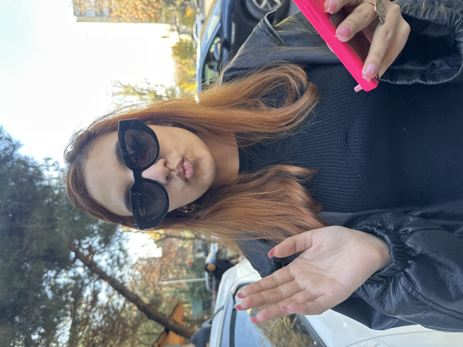 An outdoor scene in Tbilisi, Georgia, features a woman in her 20s to 30s, centrally positioned and looking directly at the camera. She has reddish-brown hair and wears black oversized sunglasses with "GUCCI" branding, a black ribbed top, and a black leather-look jacket with gathered elastic cuffs. Her lips are puckered in a "kissing" expression. Her left hand is raised with the palm forward and fingers slightly spread, displaying pink nail polish. Her right hand holds a bright pink smartphone equipped with a grip, also showing pink nail polish and a gold-colored ring on the ring finger. The background reveals a city street environment under a clear sky. To the left, a partially visible white car is parked near a wooden structure with a green roof and trees exhibiting sparse autumnal foliage. A dark-colored sedan is visible on the right, further down the street. Multi-story, light-colored buildings, consistent with Soviet-era architecture, are present in the distant background. Blurred figures of other individuals are discernible in the mid-ground. The overall setting indicates late autumn or early winter.