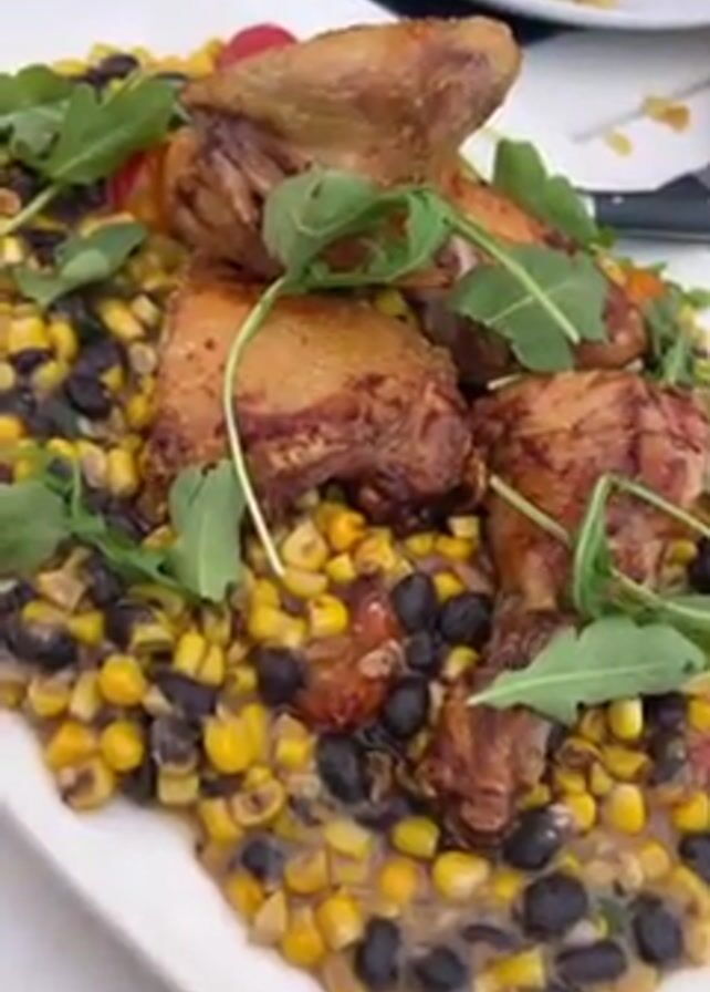 The video opens with a close-up shot of a plate of food, featuring fried chicken pieces on a bed of corn and black bean salad, garnished with arugula