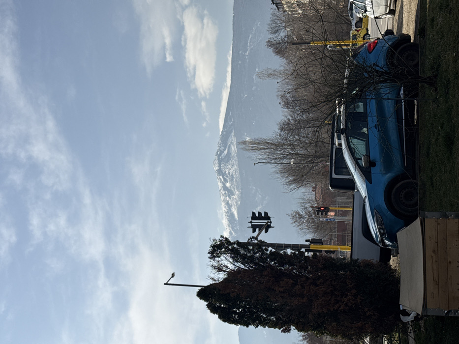 The image depicts a daytime outdoor scene in Sofia, Bulgaria, with Vitosha Mountain prominently featured in the background. The sky is light blue with scattered white clouds. In the foreground, a patch of green grass is visible, partially obscured by a dark wooden planter or raised garden bed on the lower left. To the left, a tall, slender dark green coniferous tree stands beside a black streetlight pole. In the midground, a street intersection is suggested by a set of traffic lights; one vertical signal displays a green light, while another signal further to the right, possibly for a perpendicular direction, displays a red light. Several bare deciduous trees line the street, indicating a cold season. Vehicles are present; a white pickup truck is partially visible, followed by a teal-blue compact crossover vehicle, likely a Renault Captur, parked or stopped with its side facing the viewer. Further down the street, additional vehicles, including a yellow taxi, are discernible. The background is dominated by the majestic Vitosha Mountain, its upper slopes covered in snow. The mountain exhibits a rugged, snow-dusted peak transitioning into forested lower slopes. Scattered residential or commercial buildings are visible along the base of the mountain, blending into the urban landscape of Sofia. No discernible individuals are present in the immediate foreground. The scene is illuminated by natural light, casting subtle shadows.
