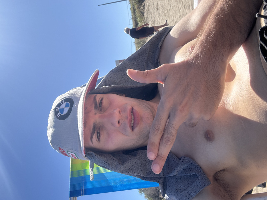 A shirtless man in a BMW hat and gray shirt reclines on a beach chair. He points a finger gun at the camera. Bright sunlight illuminates the scene. In the background, sand is visible, along with a person walking in the distance and a pole. The man is fair-skinned with short hair and facial stubble. The overall composition is casual and candid.